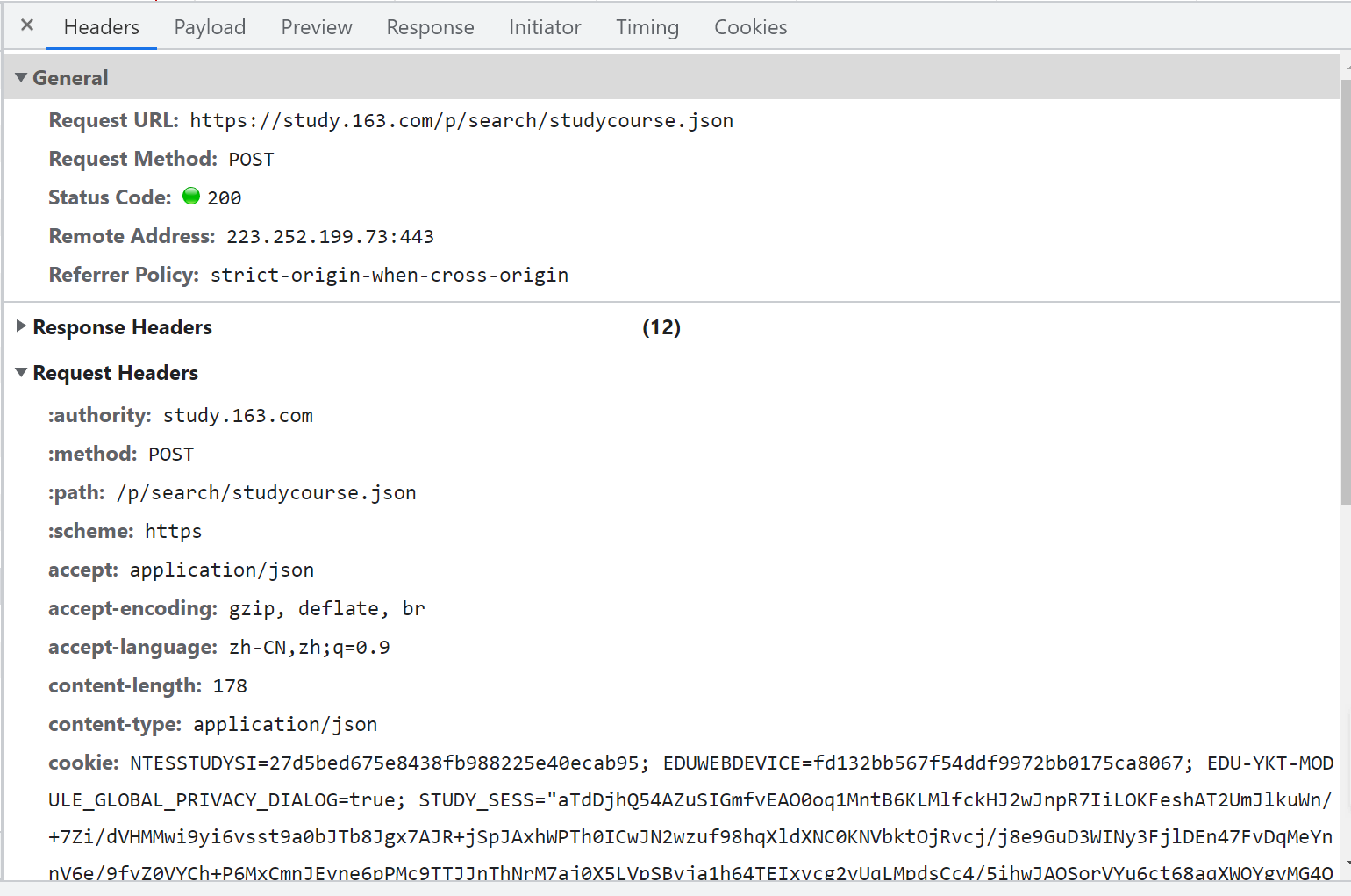 Request Headers 里面的 Accept、Content-Type、Cookie、Referer、User-Agent等是你客户端的浏览器信息,其中Cookie是你浏览器登录后缓存在本地的登录状态信息,使用Cookie登入可以避免爬虫程序被频繁拒绝。这其中的参数不一定全部需要提交。