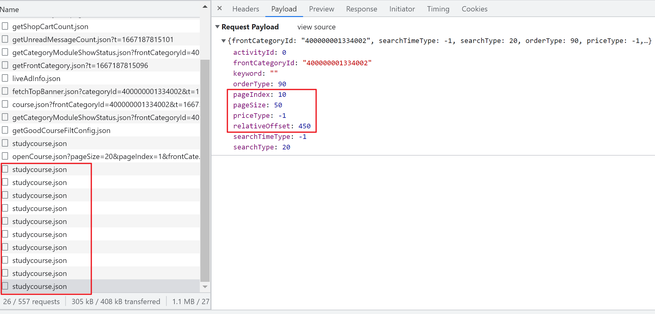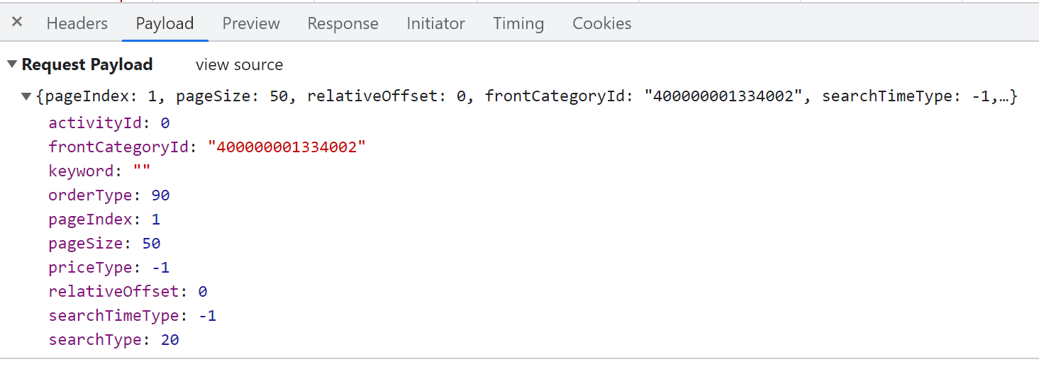 重点关注 Request Payload 下的: pageIndex, pageSize,relativeOffset, rontCategoryId 获取这些信息之后,就可以在 R 中构造 Headers