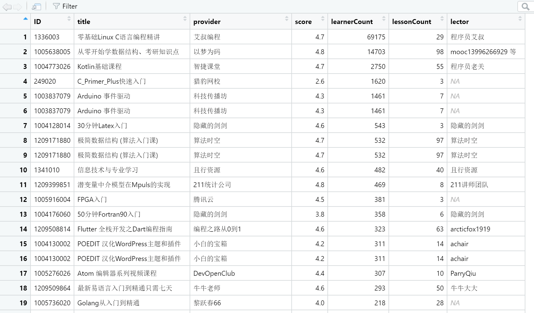 knitr::kable(head(df,10))| ID | title | provider | score | learnerCount | lessonCount | lector |