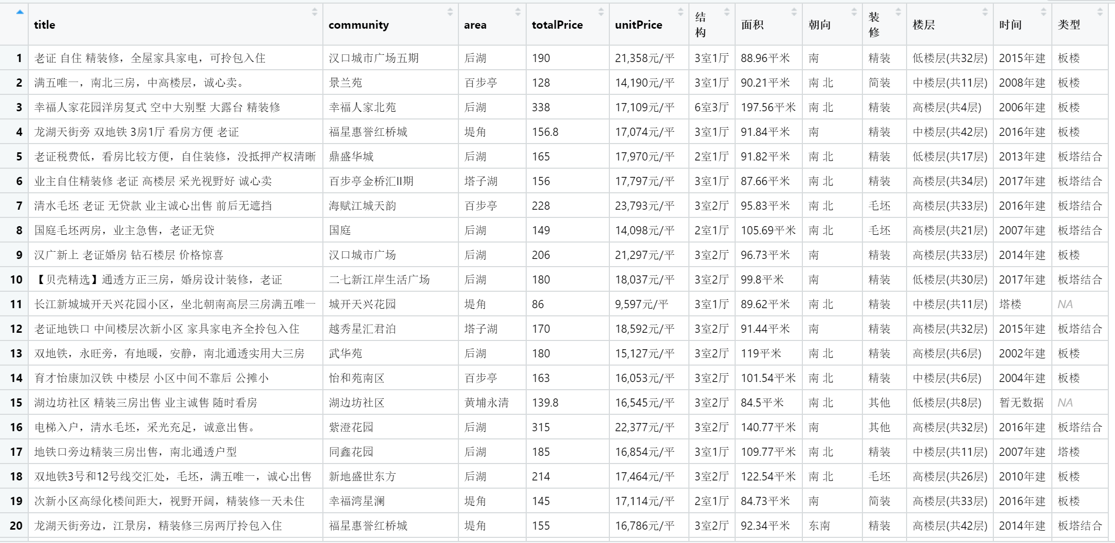 df = cbind(title,community,area,totalPrice,unitPrice,houseInfo_df)